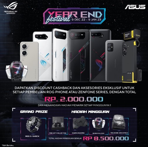 Untuk informasi promosi Year-end Festival (Discount Cashback & Giveaway) lebih lanjut, silahkan kunjungi link sebagai berikut https://rog.asus.com/event/rog-phone-6/id/ atau follow akun Instagram resmi ASUS ROG Indonesia di @asusrog.id.