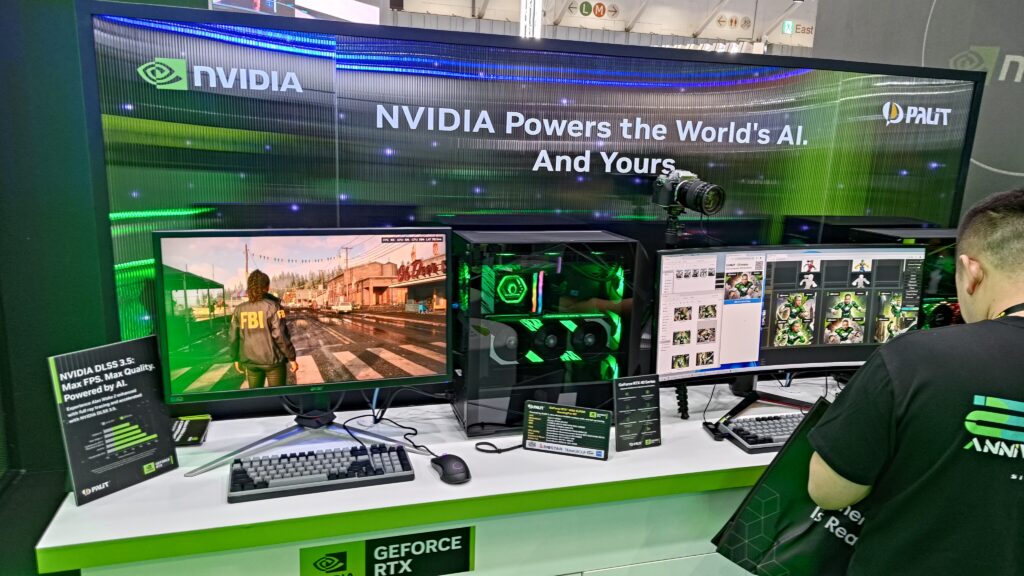 Salah satu bintang utama di stan Palit adalah RTX 4090 Neptunus, sebuah variasi dari GameRock OC yang menghadirkan solusi pendingin hibrida udara dan cairan. Kartu ini tidak menyertakan loop pendingin cair dalam paket penjualannya, namun kinerja pendinginan udaranya dirancang untuk menyerupai GameRock. Dengan adanya saluran pendingin cair, pengguna dapat menggunakan fitting G 1/4″ mereka sendiri dan menghubungkan kartu ini ke loop DIY untuk meningkatkan performa pendinginan secara signifikan.