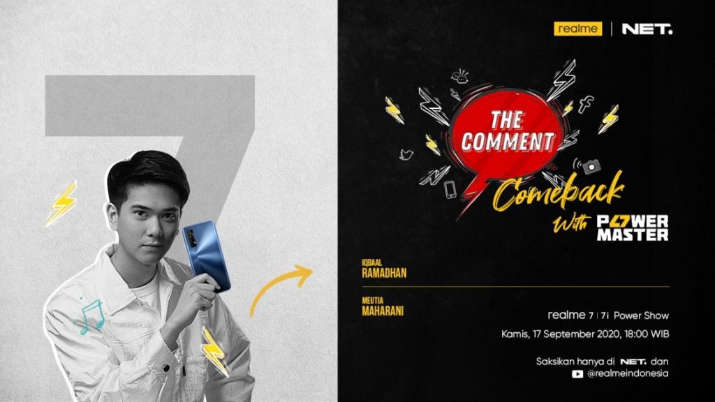 Kampanye Power Master dari realme untuk meluncurkan realme 7 | 7i 64MP Power Master di Indonesia juga ingin menghidupkan kembali power show di kalangan anak muda Indonesia. realme akan membawa kembali The Comment dengan Power Master, yang akan disiarkan secara langsung di NET TV pada tanggal 17 September pukul 18.00 WIB. Kembalinya The Comment dengan Power Master juga akan di tayangkan di beberapa akun YouTube resmi, yakni realme Indonesia, NET TV, The Comment, Tonight Show, Malam-Malam, dan Ini Talkshow. Catat tanggalnya dan ikuti keseruannya bersama realme!