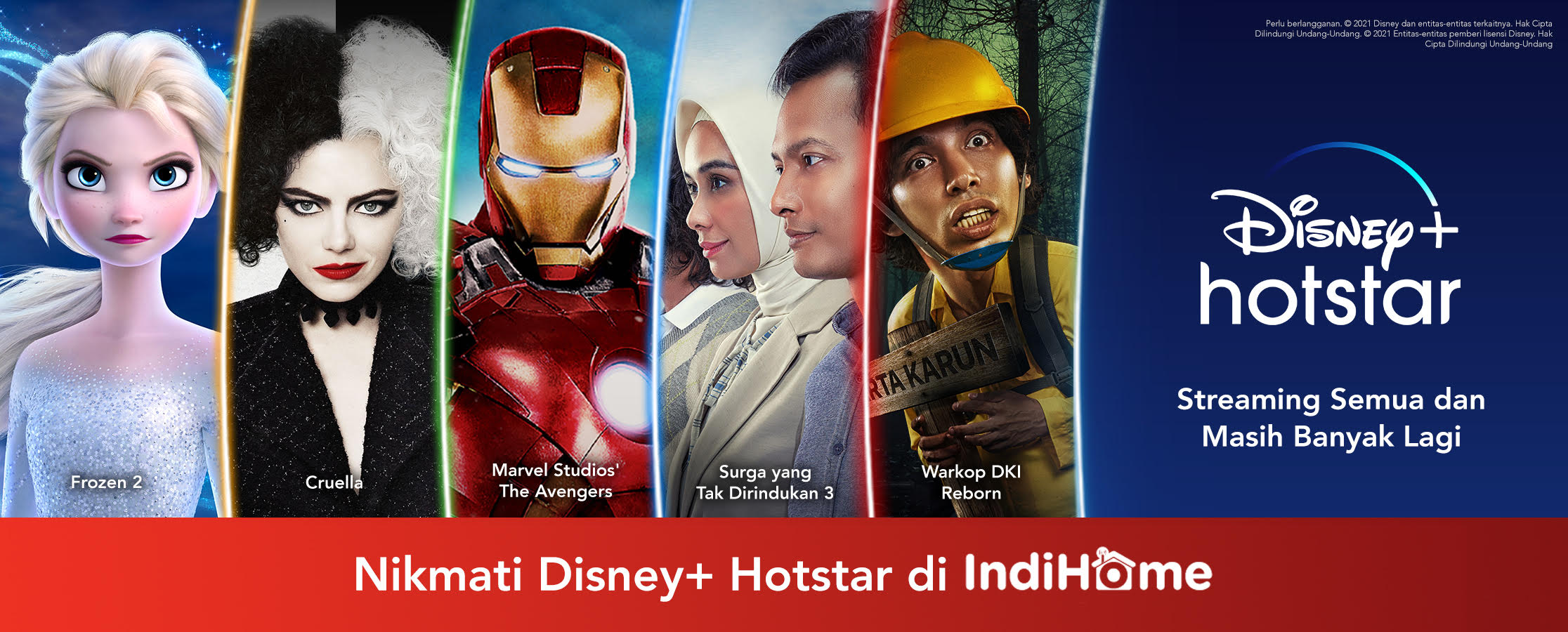 Pelanggan IndiHome dapat menikmati berbagai konten hiburan dari Disney, Pixar, Marvel, Star Wars, National Geographic, dan lainnya, serta program original eksklusif seperti film, serial, dokumenter, dan konten bentuk pendek (short-form) lainnya yang dihadirkan secara eksklusif dalam layanan ini. Tidak hanya itu, pelanggan IndiHome juga dapat mengakses ragam konten yang akan segera hadir di Disney+ Hotstar, di antaranya Marvel Studios’ “Black Widow” dan “Shang-Chi and The Legend of the Ten Rings”, Disney’s “Jungle Cruise”, hingga berbagai konten lokal yang akan datang persembahan studio terkemuka di Indonesia. Pelanggan IndiHome juga dapat menikmati serial global favorit para penggemar seperti Marvel Studios’ “Loki”, “The Mandalorian”, film Marvel Studios’ “Avengers: Endgame”, Disney’s “Aladdin” dan “Frozen 2”, Disney dan Pixar’s “Luca”, serta 10 film Indonesia terlaris sepanjang masa seperti “Warkop DKI Reborn: Jangkrik Boss! Part 1” (film #1), “Laskar Pelangi” (film #4), “Habibie & Ainun” (film #5), “Pengabdi Setan” (film #6), “Ayat-Ayat Cinta” (film #8), dan masih banyak lagi.