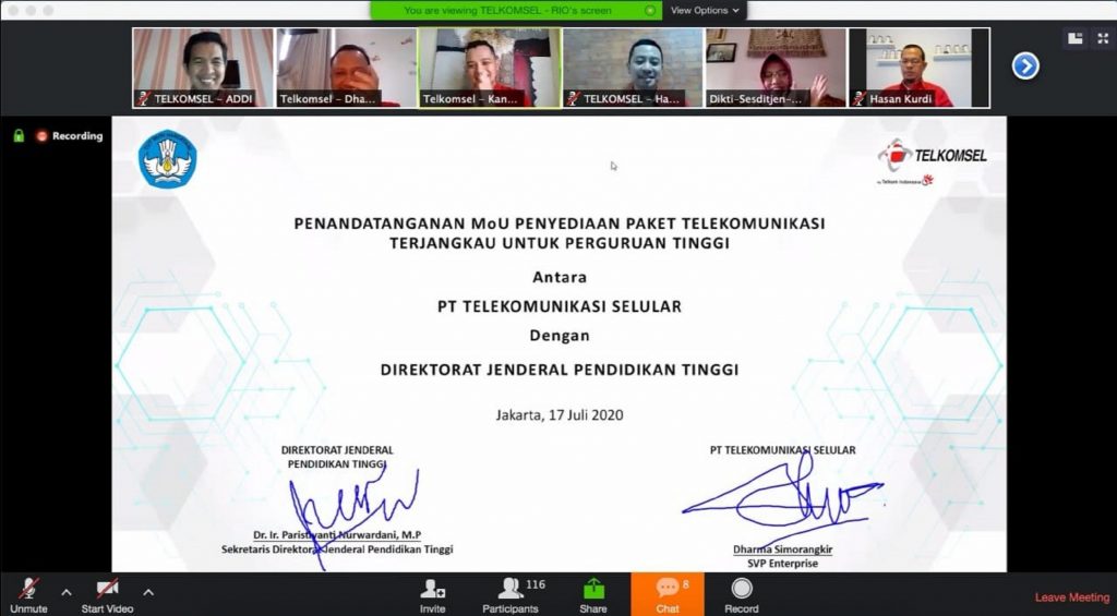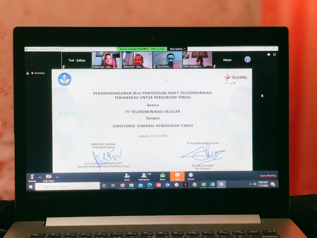 Jakarta, 17 Juli 2020 – Telkomsel sebagai leading digital telco company berkomitmen untuk mendukung upaya pemerintah dalam menyelenggarakan proses pembelajaran di berbagai tingkat pendidikan secara digital sebagai bentuk adaptasi terhadap kenormalan baru. Komitmen tersebut kini diwujudkan dengan mengumumkan kolaborasi antara Telkomsel Enterprise dengan Direktorat Jenderal Pendidikan Tinggi Kementerian Pendidikan dan Kebudayaan Republik Indonesia (Ditjen Dikti Kemendikbud RI) untuk menghadirkan program Bantuan Kuota Terjangkau bagi perguruan tinggi. Kolaborasi ini ditandai dengan penandatanganan nota kesepakatan secara virtual melalui CloudX pada Jumat, 17 Juli 2020.