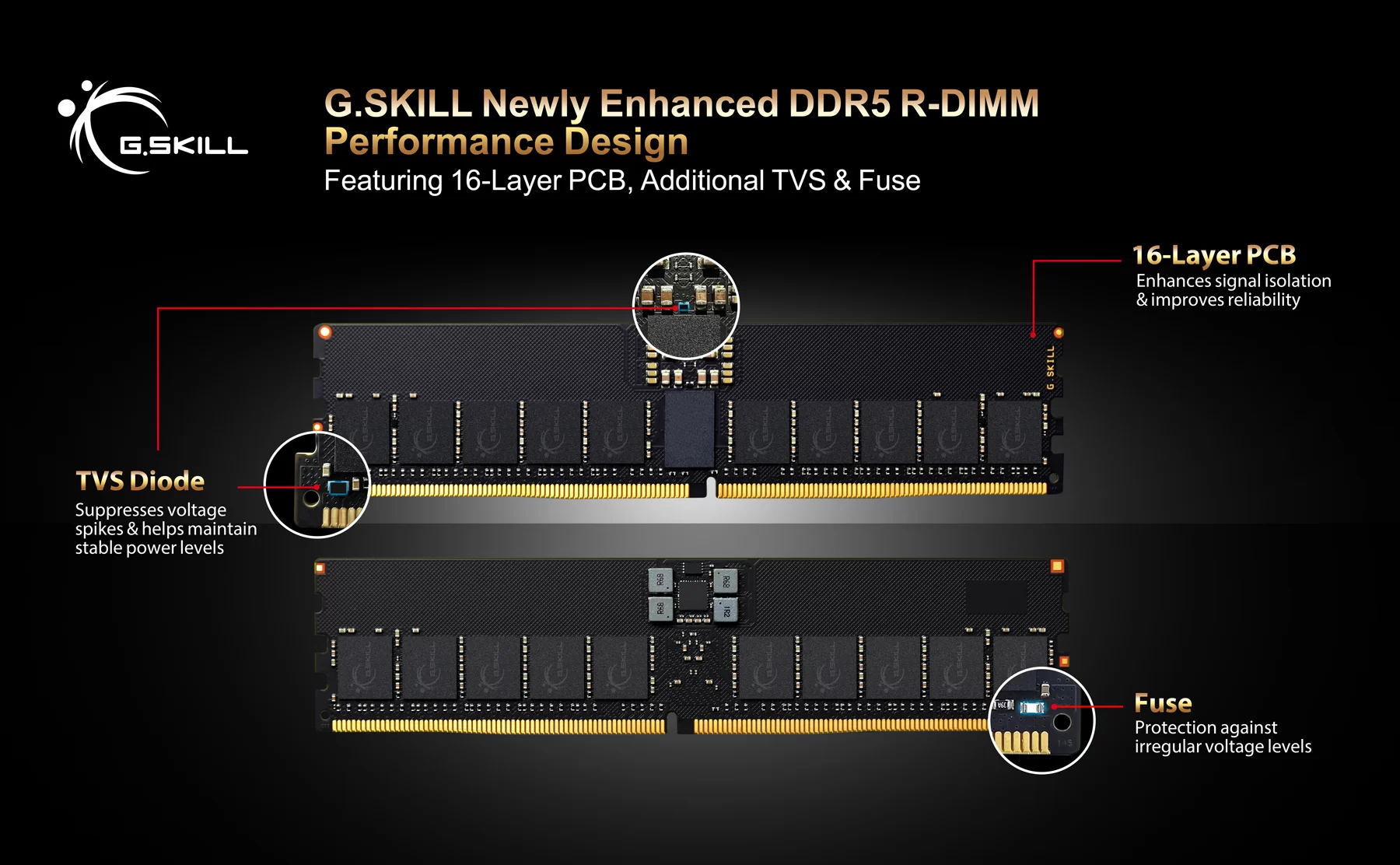 Berdasarkan standar revisi JEDEC yang baru saja dirilis untuk memori DDR5 R-DIMM, memori G.SKILL R-DIMM yang baru ini memiliki fitur PCB 16-lapisan, sebuah peningkatan yang signifikan dari sebelumnya dengan desain 8 atau 10-lapisan untuk meningkatkan integritas sinyal, serta menambahkan dua dioda penekan tegangan sementara (TVS) dan sekering untuk proteksi tegangan.