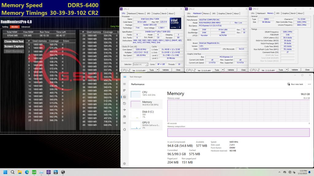 Kit memori G.SKILL DDR5-6400 CL30 dengan kapasitas 96 GB (2x 48 GB) mengkombinasikan kapasitas tinggi dan latensi rendah untuk memungkinkan performa yang lebih tinggi untuk platform dan penggunaan yang membutuhkan banyak memori. Gambar di bawah ini menunjukkan kit memori 96 GB (2x 48 GB) yang beroperasi pada DDR5-6400 CL30-39-39-102 dengan motherboard ASUS ROG Maximus Z890 Hero dan prosesor desktop Intel Core Ultra 7 265K.