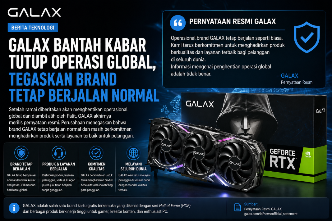 Dalam pernyataan resminya, GALAX menegaskan bahwa perusahaan masih menjalankan kegiatan bisnis seperti biasa. Operasi merek, distribusi produk, layanan pelanggan, serta dukungan purna jual disebut tetap berlangsung tanpa gangguan.