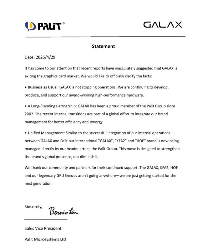 Perusahaan juga menyampaikan bahwa hubungan bisnis dan struktur operasional internal dapat berubah seiring strategi korporasi, namun hal tersebut tidak berarti penghentian brand GALAX. Dengan kata lain, rumor bahwa GALAX keluar dari industri GPU dibantah secara langsung oleh perusahaan.