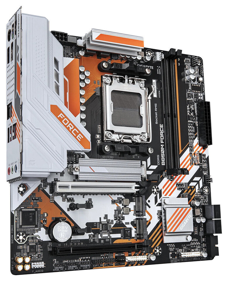 B850M FORCE hadir dalam format M-ATX dengan desain hitam-oranye-putih yang khas, termasuk pola grafis di heatsink dan chipset. Meski tampil lebih modern, nuansa khas SOC Force tetap terasa. Versi Wi-Fi 6E juga tersedia untuk pengguna yang membutuhkan konektivitas nirkabel canggih.