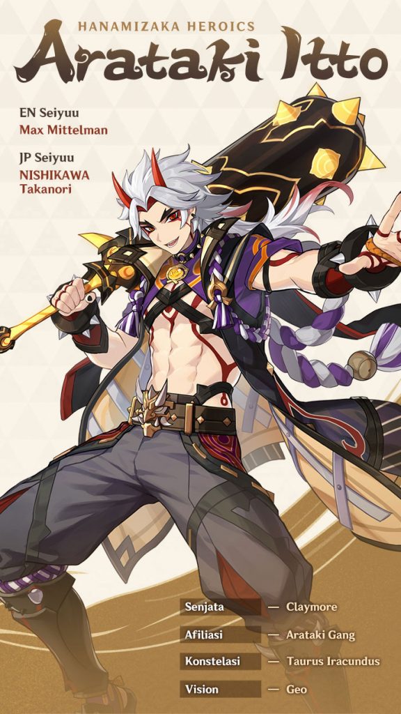 Arataki Itto adalah seorang pemuda nakal namun memiliki hati yang riang di balik mantelnya yang mahal. Ia seorang prajurit bintang 5 yang tidak kenal takut dengan darah Oni yang mengalir pada dirinya. Claymore adalah senjata utama Itto, senjata ini sangat sesuai dengan kepribadian dan postur besar Itto sebagai seorang Oni.