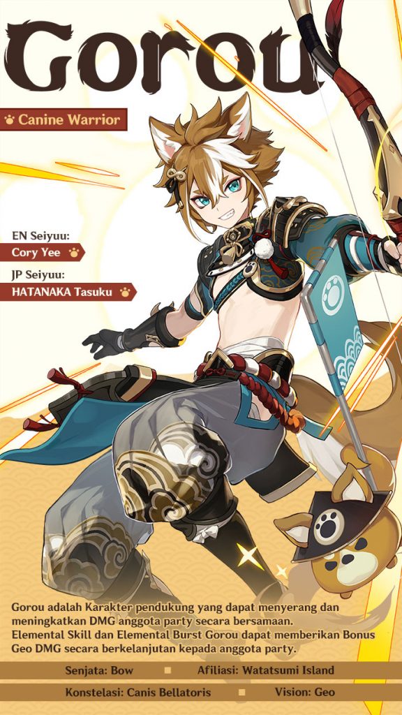 Selain Arataki Itto sang “Hanamizaka Heroics”, akan hadir juga karakter Geo bintang 4 bernama Gorou. Pengguna Bow memiliki julukan sebagai “Canine Warrior”.