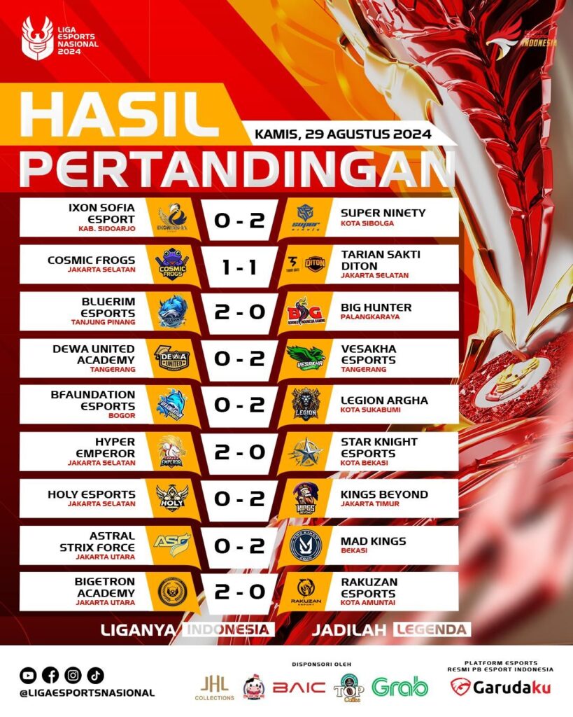 Salah satu kemenangan penting hari ini dicatat oleh Super Ninety dari Kota Sibolga yang berhasil mengalahkan Ixon Sofia Esport dari Kabupaten Sidoarjo dengan skor 2-0. Selain itu, Bluerim Esports dari Tanjung Pinang juga meraih kemenangan solid dengan mengalahkan Big Hunter dari Palangkaraya 2-0. Pertandingan lainnya yang menarik adalah duel antara Cosmic Frogs dan Tarian Sakti Diton yang berakhir imbang 1-1, serta kemenangan Vesakha Esports atas Dewa United Academy dengan skor 2-0. Legion Argha dari Kota Sukabum juga menutup hari dengan kemenangan 2-0 melawani Bfaundation Esports dari Bogor.