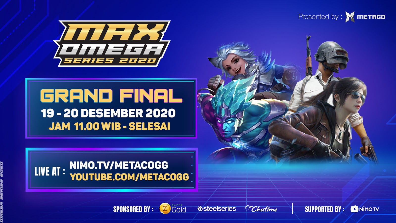 MAX Omega Series 2020 akan menggelar babak grand final-nya di 19 hingga 20 Desember 2020 jam 11:00 WIB. Untuk lebih jelasnya kamu bisa menyimak kedua banner berikut ini.