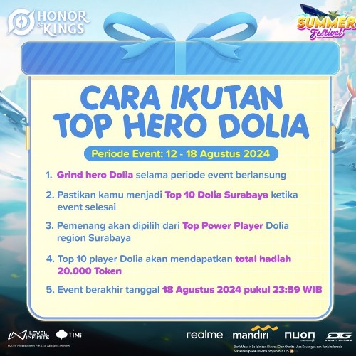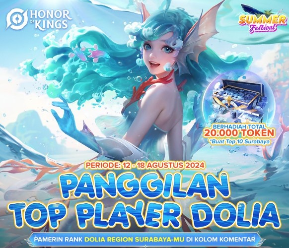 Sebagai bentuk apresiasi, Dolia telah menyiapkan 20.000 token untuk 10 pemain terbaik. Jangan lewatkan kesempatan emas ini untuk berpetualang bersama Dolia dan menjaga keindahan laut Surabaya. Tunjukkan bahwa kamu adalah pemain Honor of Kings yang tangguh dan siap menghadapi segala tantangan.