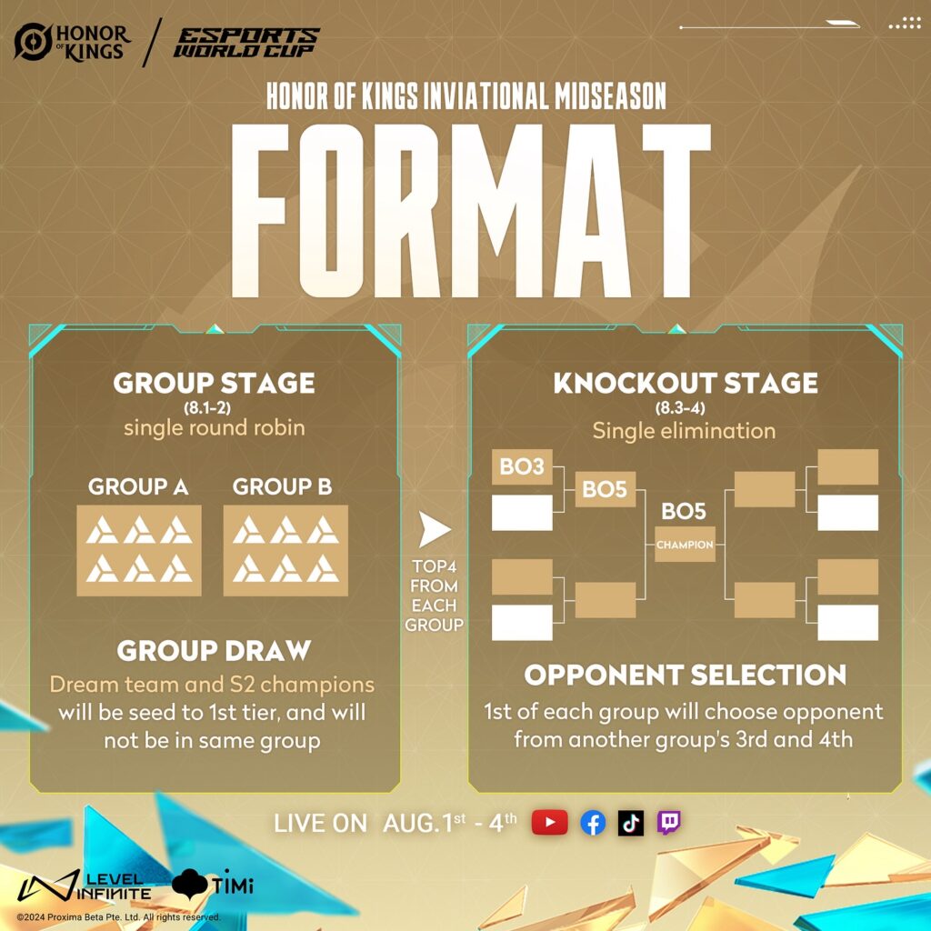 Turnamen ini menggunakan format single round-robin dengan tim dibagi dalam dua grup. Setiap tim akan bertanding dalam laga best-of-one (Bo1) untuk menentukan yang terbaik di grup. Empat tim teratas akan maju ke fase knockout stage. Jadwal lengkap: