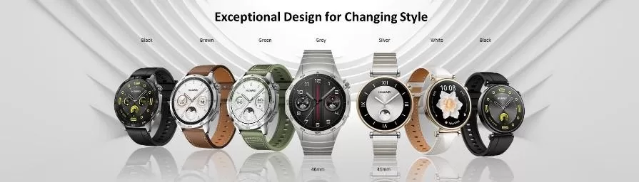 HUAWEI WATCH GT 4 yang penuh gaya dalam ukuran 46mm hadir dalam empat warna: Hitam dengan Strap Fluoroelastomer Hitam, Coklat dengan Strap Kulit Coklat, Hijau dengan Strap Woven Hijau, dan Abu-abu dengan Strap Stainless Steel Tahan Karat Terintegrasi. Sedangkan 41mm hadir dalam tiga warna: Perak dengan Strap Kunci Piano Dua Warna, Putih dengan Strap Kulit Putih, Hitam dengan Strap Fluoroelastomer Hitam