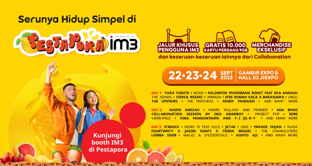 Saatnya bebas menikmati serunya hidup yang lebih simpel di #PestaporaBarengIM3 dengan tetap terkoneksi satu sama lain dengan sinyal IM3 yang kini hadir lebih luas dan stabil. Untuk informasi lebih lanjut terkait #PestaporaBarengIM3, dapat langsung mengunjungi im3.id/pestapora dan akun resmi IM3 di Instagram @indosatim3.