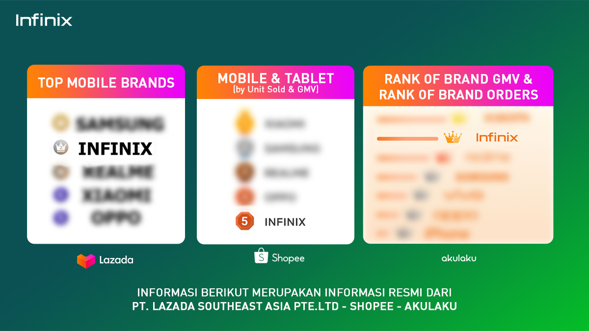 Di Shopee misalnya, Infinix masuk ke Top 5 Brand berdasarkan penjualan dan GMW di kategori smartphone. Sementara di Lazada, Infinix berhasil masuk Top 2 di kategori smartphone. Di Akulaku sendiri, Infinix juga menjadi Top 2 di kategori smartphone.