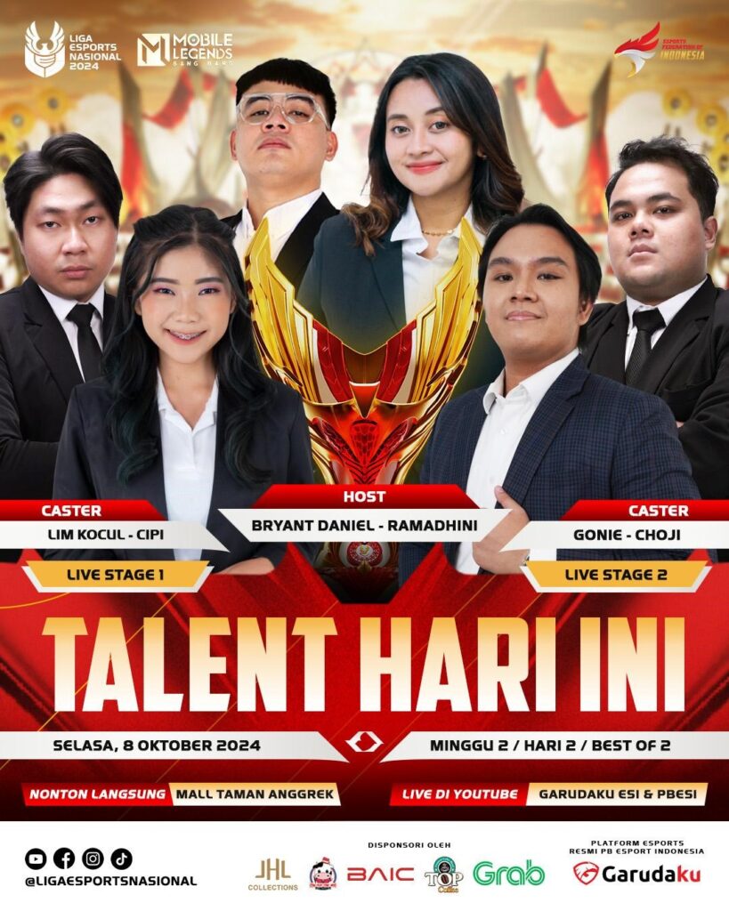 Pertandingan akan dipandu oleh caster-caster berpengalaman. Lim Kocul dan Cipi akan memandu pertandingan di Stage 1, sementara Gonie dan Choji akan memberikan narasi seru di Stage 2. Selain itu, Bryant Daniel dan Ramadhini akan berperan sebagai host acara, memandu keseluruhan kegiatan di hari kedua ini.