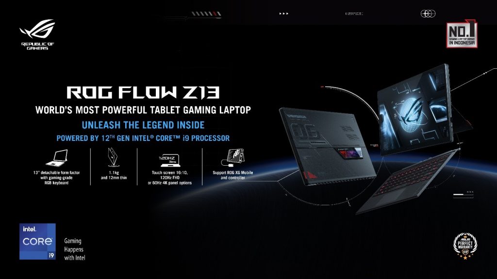 ASUS resmi memperkenalkan jajaran laptop ROG terbaru yang telah ditenagai oleh prosesor High Performance 12th Gen Intel® Core™ di Indonesia. Dalam acara peluncuran bertajuk Malam Malam Unleash The Legend Inside ROG Intel 12th Gen pada tanggal 12 April 2022 yang ditayangkan secara langsung di YouTube dan Facebook ASUS ROG Indonesia serta kanal YouTube MalamMalamNet, ASUS menghadirkan tiga laptop gaming ROG terbaru termasuk laptop sekaligus tablet gaming paling powerful di dunia, yaitu ROG Flow Z13.