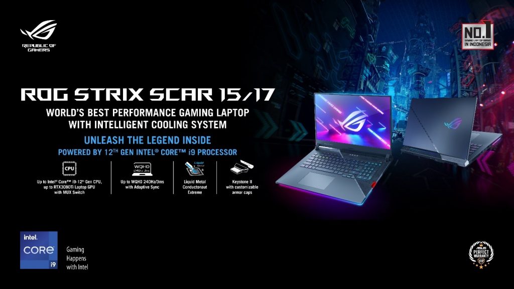 ROG Strix SCAR kembali tampil di tahun 2022 sebagai laptop untuk para penggemar eSports. Berfokus pada performa, laptop gaming ini telah dibekali dengan prosesor 12th Gen Intel® Core™ dengan varian tertingginya yaitu hingga Intel® Core™ i9-12900H yang mengusung konfigurasi 14 core dan 20 thread (6 P-core dan 8 E-core). chip grafis NVIDIA generasi terbaru yang didinginkan oleh sistem pendingin ROG Intelligent cooling™ yang telah menggunakan liquid metal. ROG Strix SCAR juga dibekali dengan MUX Switch, penyimpanan PCIe SSD Gen4 x4, serta memori DDR5 4800MHz untuk pengalaman bermain game yang maksimal.