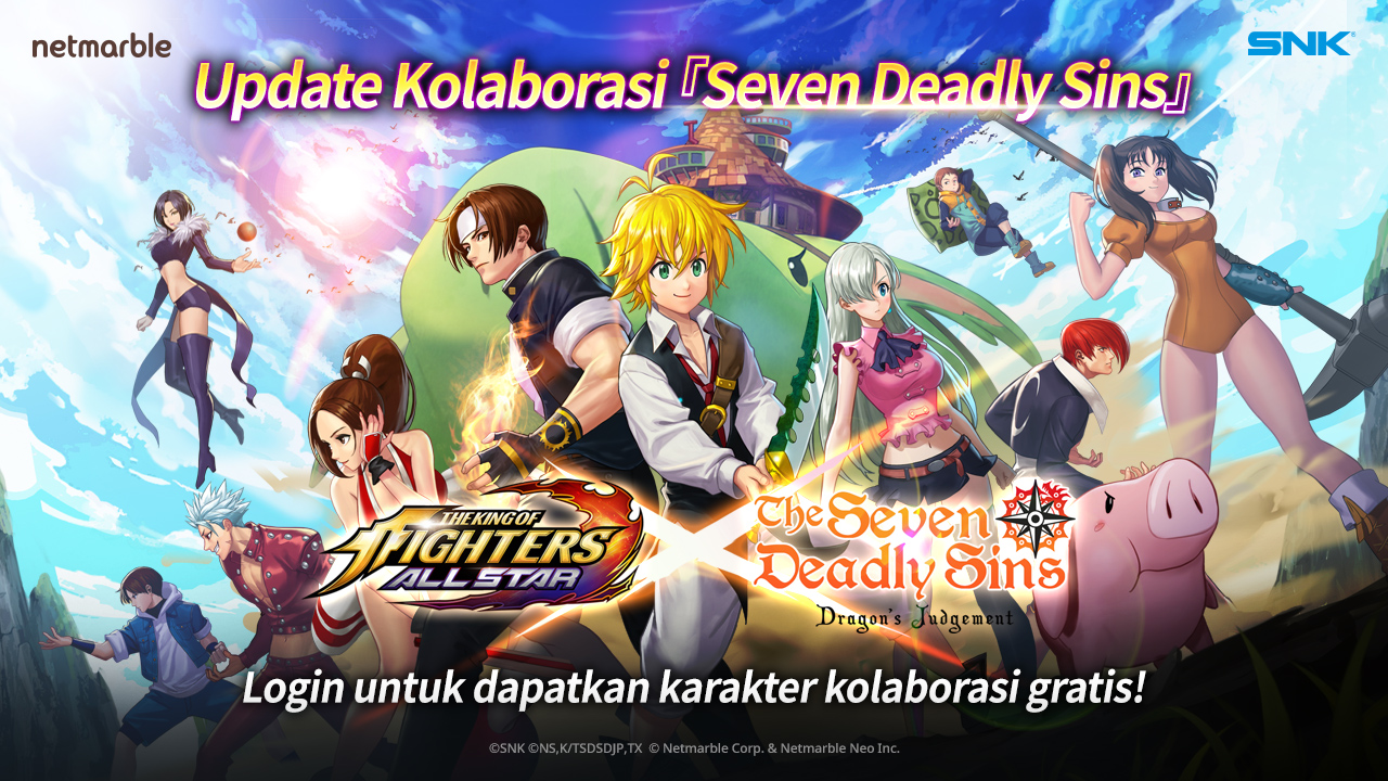 Karakter utama dari anime 「The Seven Deadly Sins: Judgement of Fury」 seperti <Meliodas>, < Elizabeth>, <Ban>, <Merlin>, <King>, <Diane>, <Bar Master Meliodas> and <Dancer Elizabeth> akan ditambahkan sebagai Fighter yang dapat dikoleksi oleh para pemain THE KING OF FIGHTERS ALLSTAR. Dengan login selama periode kolaborasi, pemain juga akan mendapatkan <Bar Master Meliodas> dan <Elizabeth> secara gratis melalui beragam event spesial.