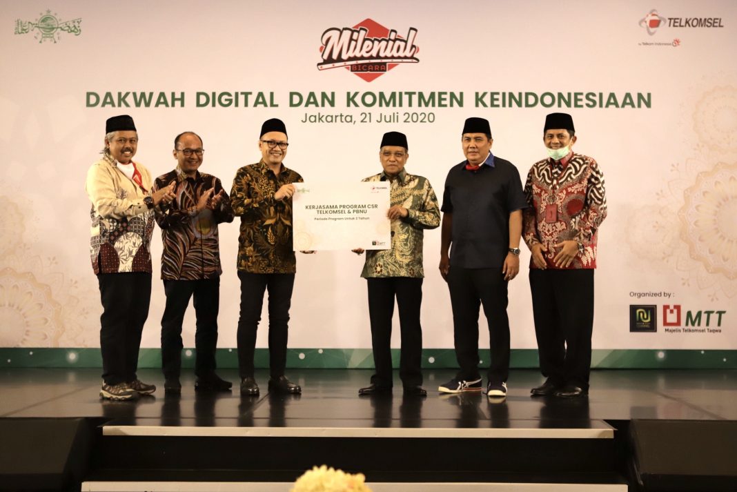 Jakarta, 21 Juli 2020 – Telkomsel secara konsisten terus bergerak maju memperkuat kemanfaatan perusahaan di tengah masyarakat, terutama dalam menghadirkan solusi yang mampu membawa perubahan nyata di setiap fase kehidupan di tengah keberagaman bangsa Indonesia. Konsistensi tersebut kini diwujudkan dengan komitmen menghadirkan kolaborasi terbaru antara Telkomsel bersama Pengurus Besar Nahdlatul Ulama (PBNU) yang memiliki tujuan bersama untuk menggerakkan sejumlah inisiatif yang diharapkan dapat menumbuhkan nilai nasionalisme dan kerohanian masyarakat Indonesia. Kolaborasi tersebut ditandai dengan penandatanganan kerja sama di sela acara “Bincang Millenial PBNU dan Telkomsel” yang digelar berkolaborasi dengan Majelis Telkomsel Taqwa (MTT) di Jakarta, (21/7).