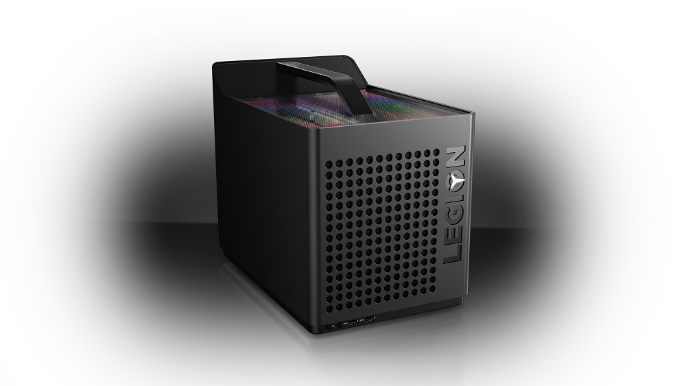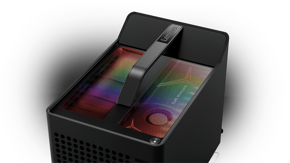 Dengan handle atas yang nyaman dan terintegrasi, cube ini mudah dipindah-pindahkan untuk merasakan pengalaman gaming di mana saja. Bagian panel atas yang transparan memungkinkan pengguna untuk melihat isi rig, menunjukkan RGB system lighting untuk berbagai warna, dapat dikostumisasi melalui Lenovo Vantage.