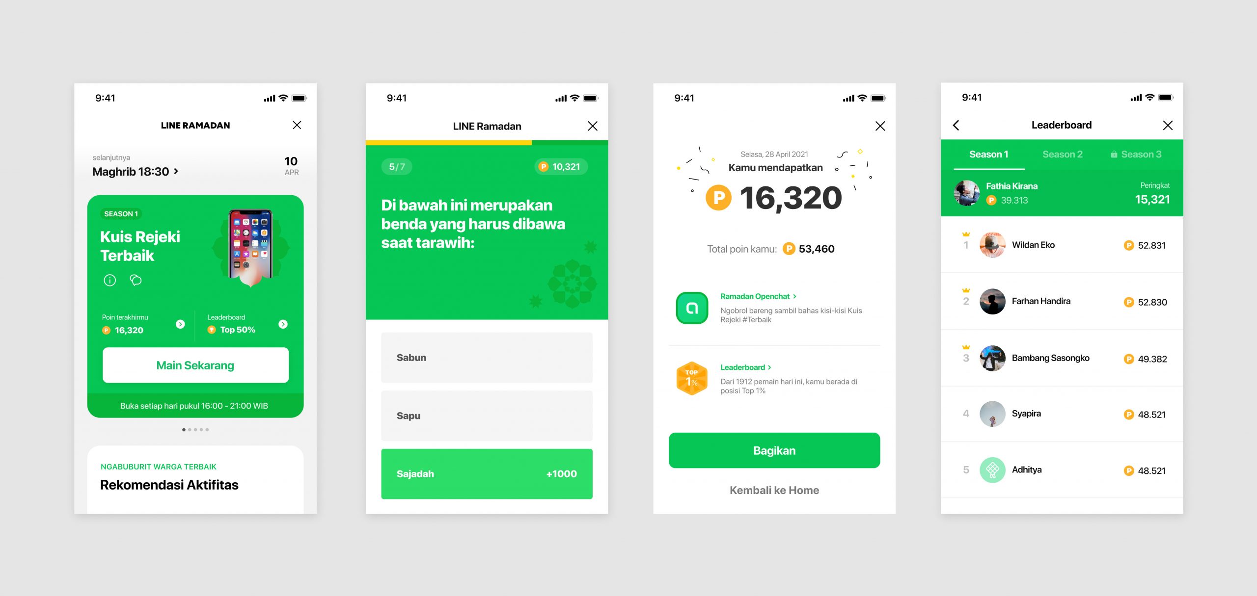 ​​LINE mengajak seluruh pengguna untuk tetap merayakan Ramadan dengan aktivitas yang edukatif, interaktif, dan menghibur sehingga kegiatan menjalankan ibadah puasa di masa pandemik tetap terasa menyenangkan. Fitur-fitur regular unggulan yang hadir di Akun Resmi LINE Ramadan, seperti Kuis Harian, Jadwal Sholat, Pengingat Sholat, Doa Harian, serta Kultum akan tetap hadir menemani pengguna. Selain itu, LINE Ramadan 2021 juga menyertakan fitur baru seperti Cerita Ramadan Terbaik dan Ngabuburit Warga Terbaik.