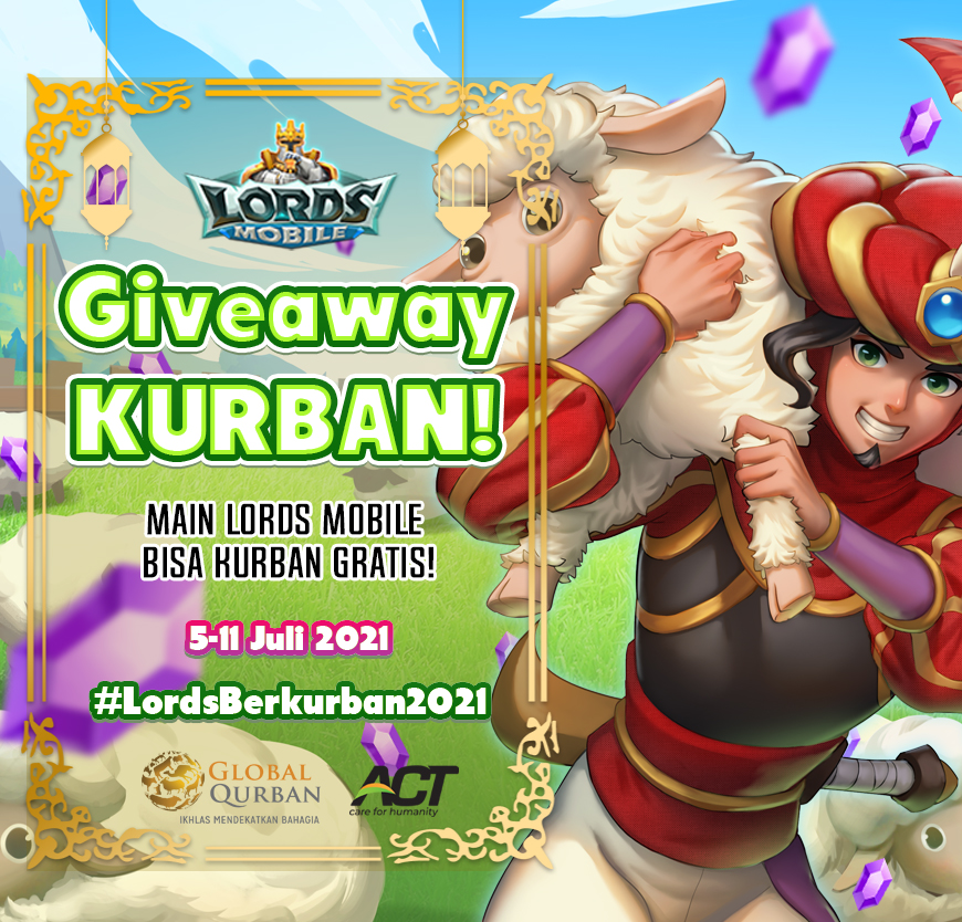 Mulai 5-11 Juli 2021, pemain bisa berpartisipasi dalam event untuk peluang meraih 1 ekor kambing atau 1/7 sapi kurban! Akan ada total 7 postingan event bertagar #LordsBerkurban2021 di Instagram Lords Mobile Indonesia (@lordsmobileidn) tiap harinya selama 7 hari tersebut. Tergantung dari jumlah postingan yang mencapai target, hingga 7 ekor kambing atau 1 ekor sapi utuh dapat dimenangkan oleh 7 pemenang sebagai kurban gratis. Selain itu, Lords Mobile juga akan bagi-bagi Permata in-game gratis untuk ratusan pemain lain selama event berlangsung.