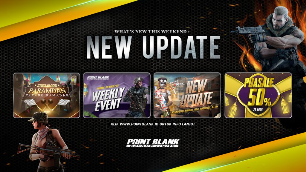 Melengkapi update kali ini ada juga event mingguan yang tak kalah seru dengan hadiah yang item dalam game yang bisa kalian dapatkan untuk memperkuat diri kalian di pertarungan Point Blank. Selain itu masih ada event diskon untuk item tertentu yang akan dimulai pada tanggal 23 April 2021 mendatang.