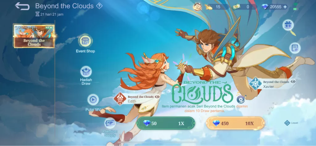 Para pemain bisa mendapatkan salah satu skin dari Edith atau Xavier, bahkan keduanya, melalui kupon undian. Moonton memberikan kesempatan bagi pemain untuk memperoleh total 38 kupon undian “Beyond The Clouds” yang dibagi menjadi dua periode. Periode pertama pada 19-22 Agustus 2023, sedangkan periode kedua pada 26-29 Agustus 2023, yang masing-masing akan memberikan 19 kupon.
