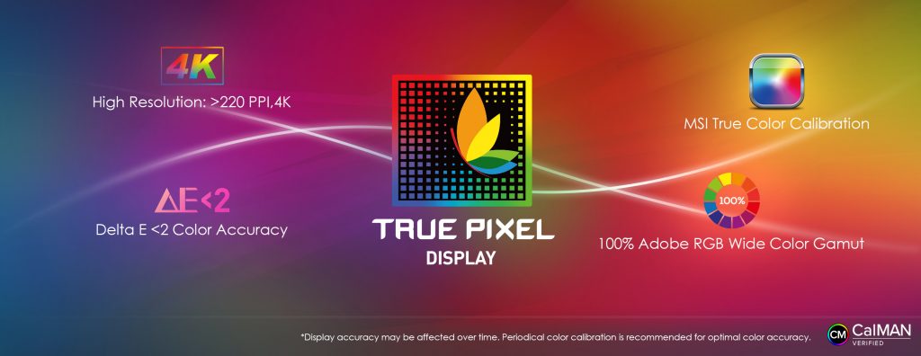 Lihat untuk percaya! Ketepatan warna yang tinggi dapat membantu para kreator untuk merancang karya mereka dengan mudah; juga tahu bagaimana karya mereka akan terlihat bagi penonton. Dirancang khusus untuk para profesional, layar True Pixel MSI, yang menampilkan resolusi UHD 4K, kalibrasi True Color untuk warna yang lebih presisi, gamut warna 100% AdobeRGB untuk mewakili berbagai macam warna dengan lebih baik, serta menjamin akurasi warna Delta-E<2 terdepan di industri, hingga mencapai tampilan warna yang nyata pada layar. Semua layar True Pixel juga diverifikasi CalMAN untuk representasi visual yang paling akurat dan tepat.