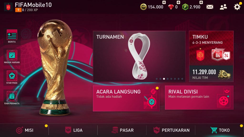 Mulai 9 November 2022, para pemain FIFA Mobile akan dapat rasakan ketegangan berkompetisi bersama negara favoritmu dalam mode single-play FIFA World Cup™ 2022. Pada mode permainan ini, pemain bisa mengendalikan 32 tim nasional (timnas) otentik dari negara-negara yang lolos kualifikasi Piala Dunia dalam memperebutkan tahta juara, mencapai kejayaan, dan menyaksikan mereka mengangkat piala juara FIFA World Cup™ 2022!