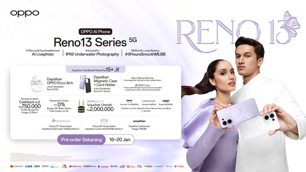 Konsumen yang melakukan pemesanan selama periode ini berkesempatan mendapatkan berbagai keuntungan eksklusif dengan total nilai hingga Rp15+ juta, seperti OPPO Enco Air4 gratis untuk pembelian Reno13 5G, Magnetic Case + Card Holder gratis untuk Reno13 F Series, serta layanan Reno Refresh Service yang mencakup dua kali penggantian pelindung layar setiap tahun, dan perlindungan OPPO Care selama satu tahun.