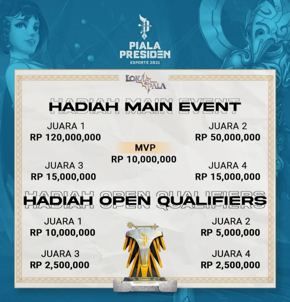 Di babak main event inilah para peserta akan berjuang memperebutkan hadiah utama. Tim yang berhasil keluar sebagai juara Piala Presiden Esports 2021 cabang gim Lokapala akan memperebutkan uang tunai sebesar 120 juta rupiah.