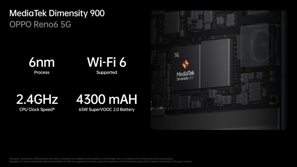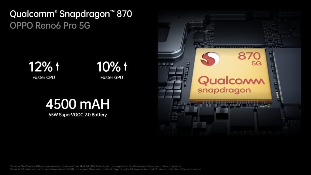 OPPO Reno6 Series 5G dibekali dengan dua pilihan chipset yang akan menjamin smartphone tetap optimal di berbagai situasi. OPPO Reno6 5G adalah smartphone pertama yang menampilkan SoC terintegrasi 5G terbaru MediaTek, Dimensity 900, yang dibangun di atas prosesor 6nm. Sedangkan OPPO Reno6 Pro 5G ditenagai oleh chipset Qualcomm® Snapdragon™ 870 5G dengan CPU Kryo 585 mutakhir, yang dapat beroperasi hingga 3,2 GHz, menjadikannya kecepatan tertinggi yang dicapai hingga saat ini di dunia seluler.