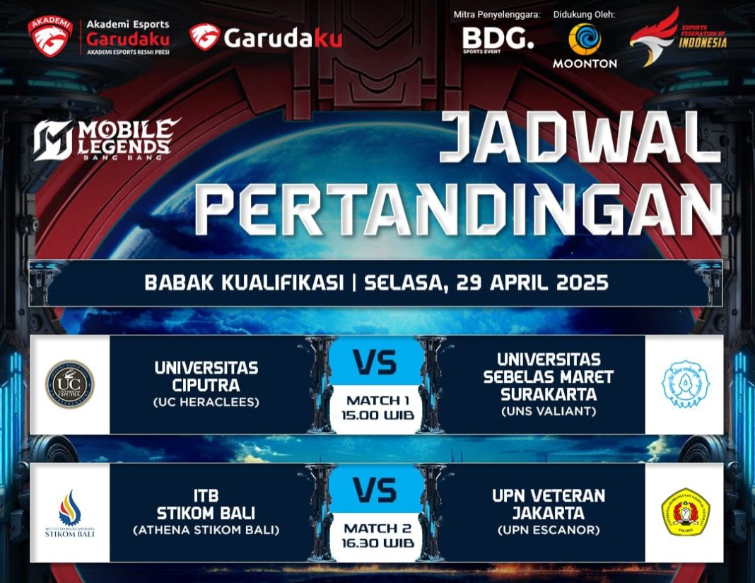 Hardwareholic – Hari pertama babak Group Qualification Liga Esports Nasional Mahasiswa 2025 dibuka dengan pertarungan sengit yang disiarkan secara langsung melalui kanal YouTube Akademi Esports Garudaku. Dua pertandingan utama mempertemukan UC HERACLEES dari Universitas Ciputra melawan UNS VALIANT dari Universitas Sebelas Maret Surakarta, serta ATHENA STIKOM BALI menghadapi UPN ESCANOR dari Universitas Pembangunan Nasional Veteran Jakarta. Kedua laga ini tidak hanya menampilkan strategi dan keterampilan tinggi, tetapi juga semangat kompetitif luar biasa dari para mahasiswa dalam mewujudkan semangat #DariHobiJadiPrestasi.