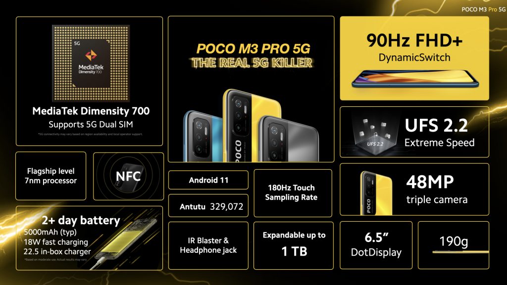 Di bawa ke pasar Indonesia sebagai “The Real 5G Killer”, POCO M3 Pro 5G menawarkan peningkatan performa dan kecepatan secara keseluruhan. Chipset Dimensity 700 yang tangguh di dalamnya memberikan performa flagship-level dengan tetap mempertahankan daya konsumsi yang lebih rendah untuk masa pakai baterai yang tahan lama berkat teknologi pemrosesan 7nm. Dengan modem 5G terintegrasi, perangkat ini mendukung dual 5G* standby, memberikan pengguna koneksi 5G yang selalu aktif tanpa menukar kartu SIM secara fisik.