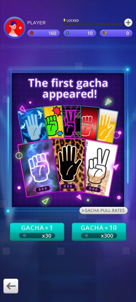Game JANKEN juga turut menghadirkan fitur gacha dimana pemain mendapatkan kartu dengan berbagai macam rarity, mulai dari Lv.0, Lv.1, Common, Rare, Epic dan Legendary. Untuk bisa nge-gacha, kalian memerlukan item bernama Gacha Medal yang bisa didapatkan dengan memenangkan Match di Minor maupun Major. Setiap 1x gacha kalian memerlukan 30 Gacha Medal dan 10x memerlukan 300 Gacha Medal.