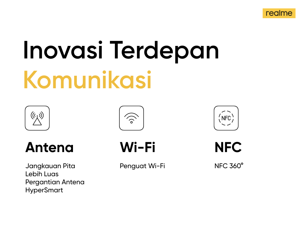 Dalam hal penguat jaringan Wi-Fi, antena Wi-Fi dirancang secara simetris untuk memastikan kekuatan sinyal yang lebih seimbang di sekitar smartphone. Dalam uji yang dilakukan oleh realme, desain ini terbukti dapat meningkatkan stabilitas sinyal sebesar 20% dibandingkan dengan desain antena Wi-Fi yang tidak simetris.