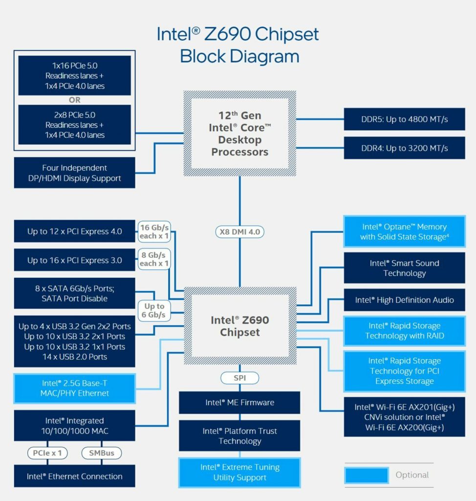 Chipset Z690 adalah chipset klien pertama Intel dengan konektivitas PCI-Express 4.0 yang berkomunikasi ke prosesor “Alder Lake-S” melalui bus chipset DMI 4.0 x8. Konektivitas PCIe mencakup jalur 12 x Gen 4 dan 16 x Gen 3 PCIe. Konektivitas lain yang terpasang pada chipset sama seperti seri Z590, termasuk dukungan MIPI SoundWire, NVMe RAID, 8-port SATA 6 Gbps, dan antarmuka jaringan yang direkomendasikan meliputi 2,5 GbE dan Wi-Fi 6E dengan acuan dari Intel AX200.