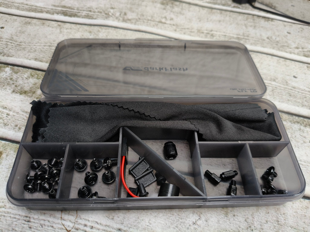 Untuk menemani proses perakitan, darkFlash menyertakan kotak aksesori dengan desain menarik. Di dalamnya, saya menemukan berbagai baut, penutup port, speaker, buzzer motherboard, ziptie, dan kain microfiber.