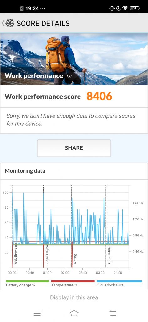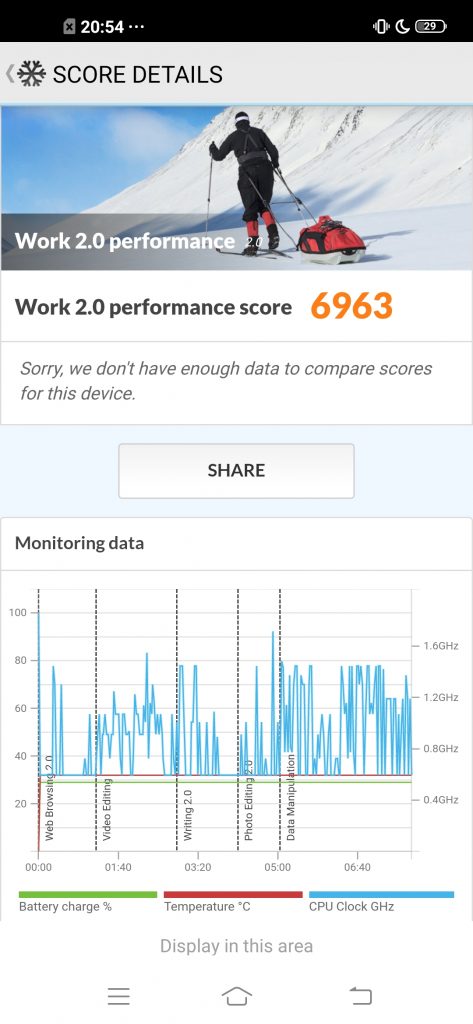 Baterai Li-Ion 5000 mAh yang disematkan pada Z1 Pro ini diberikan pengujian dengan memutar video 720p terus-menerus dengan volume dan kecerahan 50 % termasuk pengujian saat bermain game PUBG mobile.