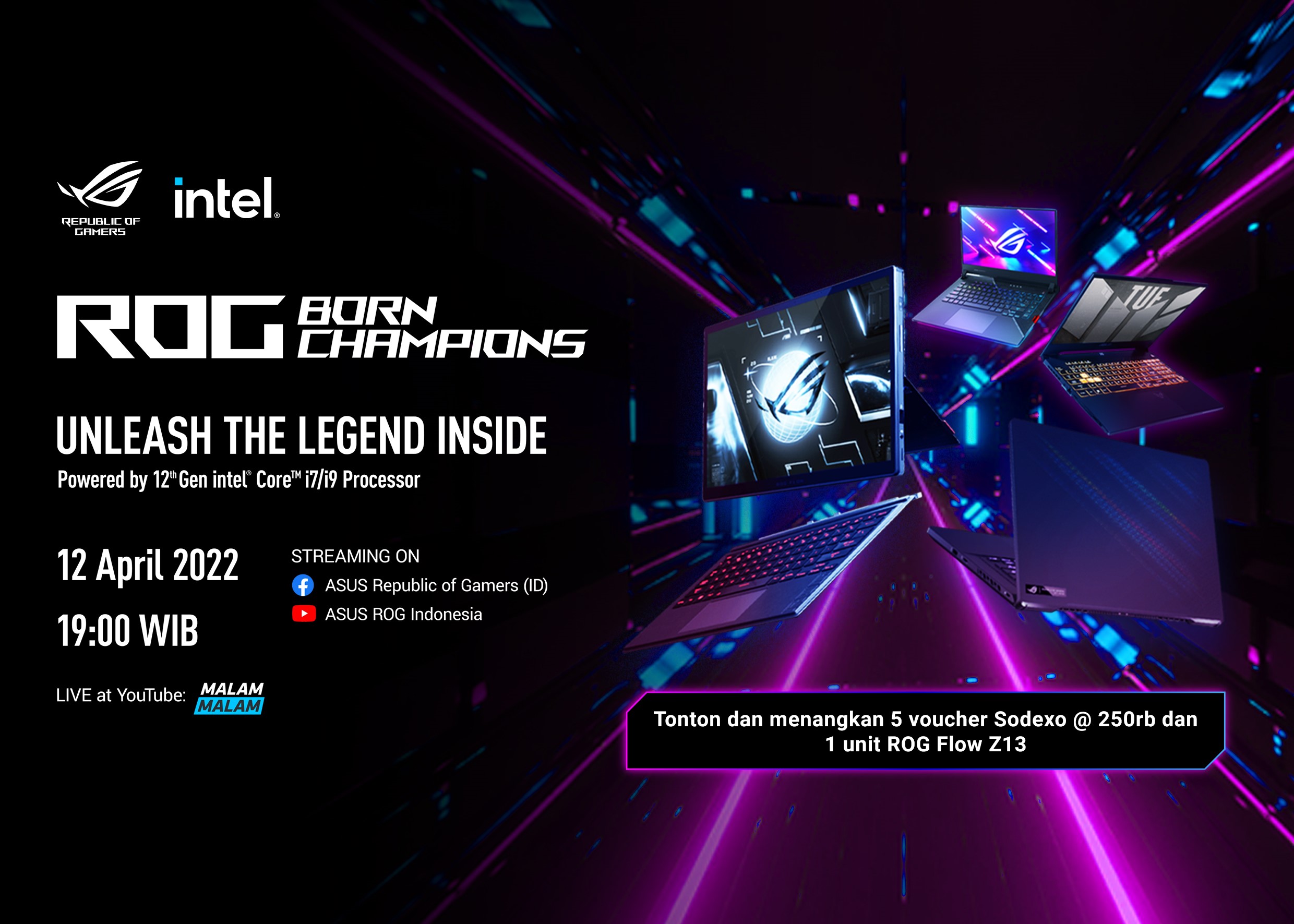 Acara Malam Malam Unleash The Legend Inside ROG Intel 12th Gen sendiri akan ditayangkan secara langsung pada tanggal 12 April 2022 pukul 19.00 WIB dan dapat disaksikan melalui platform berikut ini: