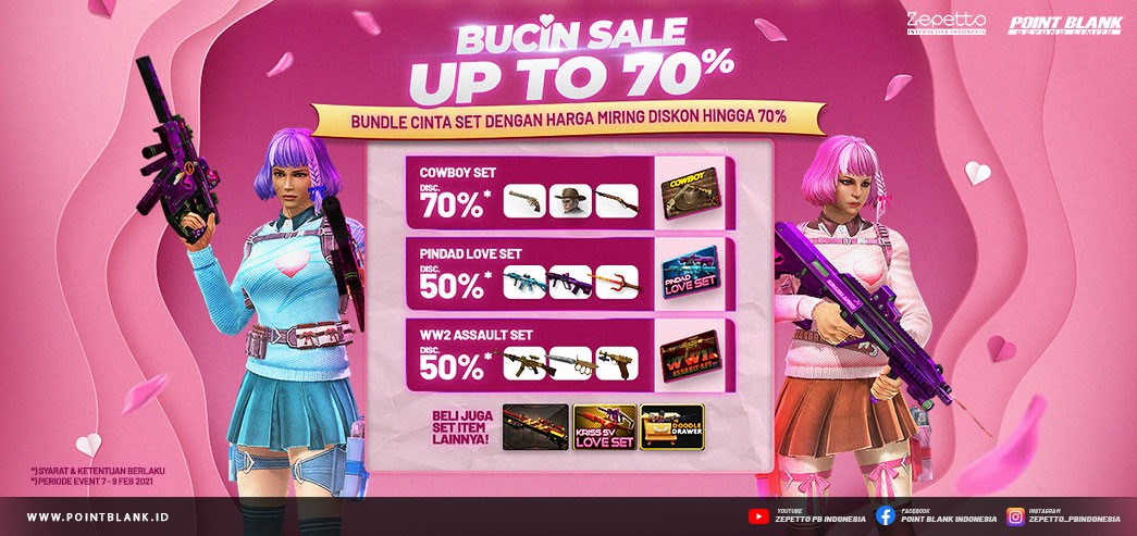 HardwareHolic.com – Sambut hari kasih sayang tahun ini Point Blank kembali menghadirkan promo dan update seru. Promo dan update ini dihadirkan spesial untuk menemani hari kasih sayang para Troopers. Promo pertama kali ini ada Bucin Sale Up 70%, di mana Troopers bisa mendapatkan set item favorit dengan harga diskon hingga 70%.