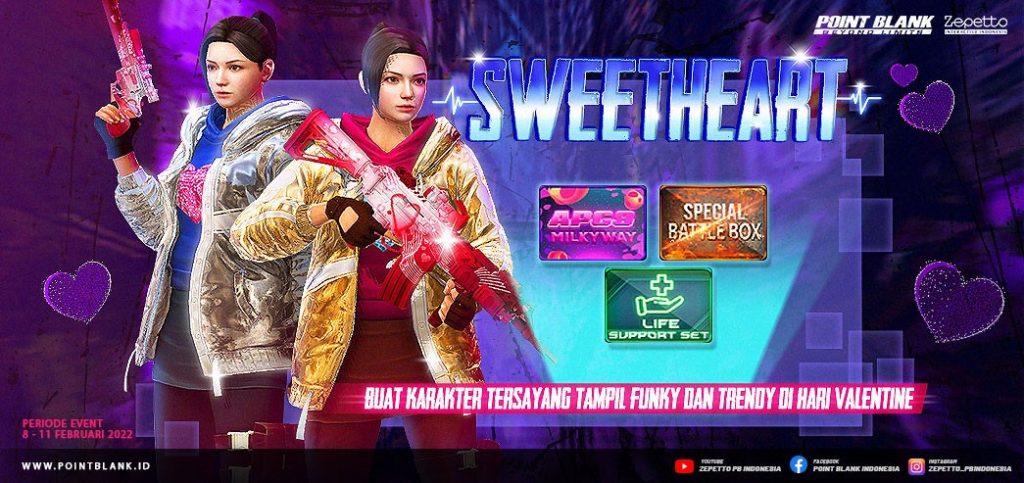 Selain promosi diskon spesial, ada juga skin terbaru edisi Valentine, Sweetheart Skin seri. Seri ini memiliki corak khas Valentine, yaitu warna merah muda dan putih yang melambangkan ungkapan cinta dari seorang gadis. Pastinya weapon seri Sweetheart ini cocok untuk digunakan di hari Kasih Sayang bersama orang yang Troopers sayangi.