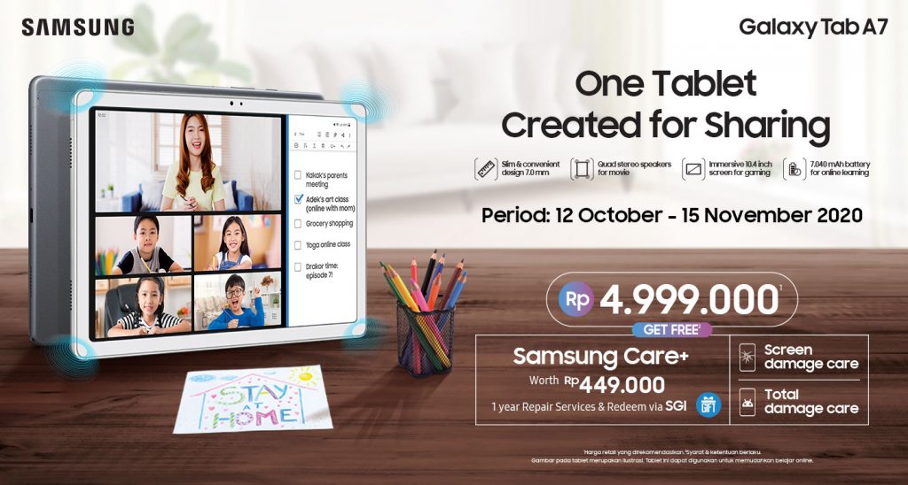 Untuk informasi lebih lanjut, silakan kunjungi www.samsung.com/id/TabA7 untuk Galaxy Tab A7 dan https://www.samsung.com/id/offer/samsung-care-plus/ untuk Samsung Care+.