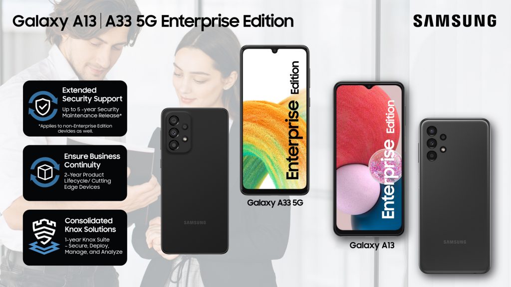 Hardwareholic – Samsung Electronics Indonesia resmi merilis seri terbaru dari lini smartphone Galaxy Enterprise Edition, solusi perangkat seluler dengan keandalan dan keamanan terdepan untuk mendukung keberlanjutan bisnis. Terdiri dari Galaxy A13 Enterprise Edition dan Galaxy A33 5G Enterprise Edition, Samsung memberi pilihan yang luas bagi pelaku industri di berbagai level bisnis maupun lembaga pemerintahan untuk mengoptimalkan operasionalnya sesuai kebutuhan melalui perangkat mobile dengan keunggulan maintenance update terbaik, product lifecycle yang panjang, dan end-to-end security.
