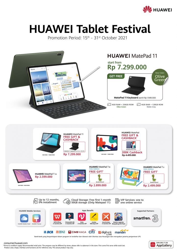 Pada periode 15 hingga 31 Oktober 2021 , Huawei memberikan penawaran menarik pada konsumen Indonesia yang ingin memiliki jajaran produk tablet Huawei. Huawei MatePad 11 hadir dengan harga yang menarik seharga mulai dari Rp 7.299.000 untuk varian Matte Gray dan bisa mendapatkan MatePad 11 Keyboard senilai Rp 1.599.000 secara gratis. Pada HUAWEI Tablet Festival juga memberikan cashback senilai Rp 200.000 pada pembelian HUAWEI MatePad seharga Rp 4.499.000; Huawei MatePad T10 seharga Rp 2.599.000; MatePad T10 Kids Edition seharga Rp 2.899.000 dengan hadiah boneka menarik; dan MatePad T8 Kids Edition dengan harga Rp 2.499.000 juga akan mendapatkan hadiah boneka.