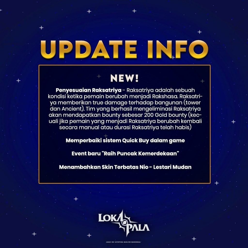 Bukan hanya event aja nih, ternyata Lokapala juga telah melakukan beberapa update patch pada game, sehingga permainan semakin seru dan menegangkan. Salah satu update yang dilakukan Lokapala Sistem Pertahanan Tower. Update ini akan membuat buff baru yang menambahkan pertahanan fisik dan magic ke tower berdasarkan jumlah Ksatriya yang berada di sekitarnya. Jadi update pada Meta Tower ini berbeda dengan game MOBA pada umumnya. Karena pemain akan dibuat untuk memutar otak dan berpikir secara taktis.