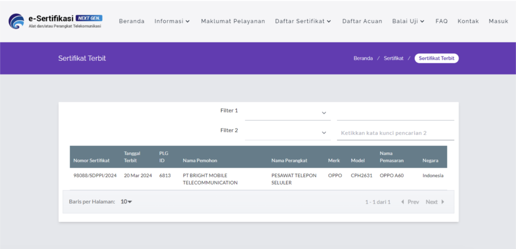 Berdasarkan data yang tercatat di situs SDPPI, OPPO A60 telah terdaftar dengan nomor 98088/SDPPI/2024, yang didaftarkan oleh PT. Bright Mobile Telecommunication pada tanggal 20 Maret 2024. Ini menunjukkan bahwa OPPO telah memperoleh izin untuk memasarkan resmi perangkat A60 di Indonesia. Sementara itu, sertifikat TKDN dengan nilai 36.65% yang tercatat melalui situs P3DN Kemenperin menegaskan bahwa OPPO A60 memenuhi persyaratan minimum kandungan komponen lokal yang ditetapkan oleh pemerintah Indonesia.
