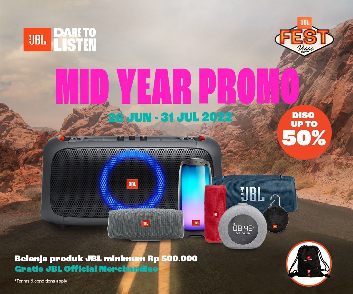Tiket sudah aman dan booking hotel telah dilakukan! JBL tengah mengadakan promosi tengah tahun yang mengangkat tema ‘Dare To Listen’, mulai dari 26 Juni hingga 31 Juli 2022 (5 minggu). Dalam promosi ini, tersedia diskon hingga 50% untuk semua produk JBL khusus untuk transaksi di toko retail resmi JBL store di Indonesia, aplikasi JBL, dan web commerce JBL. Dengan pembelanjaan minimum Rp500k, maka akan mendapatkan merchandise spesial Dare To Listen dari JBL. Diskon hingga 50% untuk produk bluetooth speakers khusus di JBL Official Store Blibli, Lazada, Shopee dan Tokopedia. Dengan pembelanjaan minimum Rp500k, maka akan mendapatkan merchandise spesial Dare To Listen dari JBL.